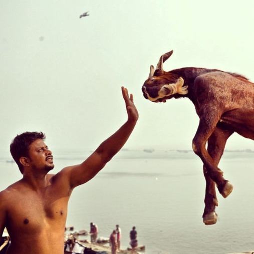 This individual appears to possess supernatural abilities that successfully halted the goat just as it was preparing to lunge at him. This scenario is captured in the image, suggesting that the goat’s attack was thwarted. It is left unclear whether the goat ultimately collided with the man following the snapshot.