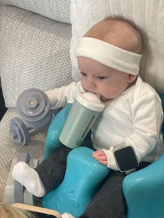 Babies cannot work out, but they can be curious about different things. It seems that physical activity and exercise tools intrigue this kid the most. After all, his parents have gotten him various toys for working out. The baby is also dressed up for the session and wearing a smartwatch to track his fitness data. The protein shake bottle also adds to the hilariousness of this image. His parents may have dressed him up to take him to their gym’s daycare. It is likely that this kid will love working out in the future because of the positive environment around him.