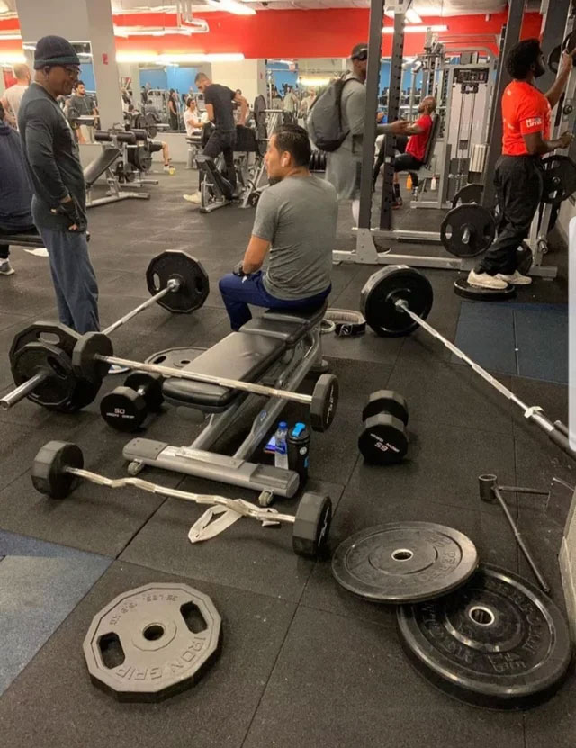 Having to wait for your chance to utilize gym equipment can be quite frustrating, particularly for individuals who lack patience. The individual depicted in the image appears to be one such person who is eager to avoid any delays. He has gathered various pieces of equipment and positioned them close by to ensure uninterrupted access during his workout. While this approach may seem efficient, not all gym members may appreciate it, as indicated by the expression of the individual in the background observing the one seated. Though collecting equipment may appear to expedite one’s workout, it can potentially lead to conflicts with gym management.