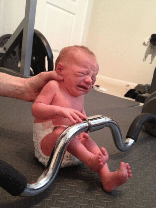 The person in this picture decided to use his home gym for a baby photoshoot. His kid does not seem to be happy about it. It was creative of the person to bring his child near an exercise tool when he was crying. The situation must have been funny for him and his friends. It is good that babies don’t remember everything from their childhood. Otherwise, this kid must have been traumatized to go to the gym after becoming an adult. The large equipment must have traumatized the kid. We just hope that the child wasn’t hurt by the tools.