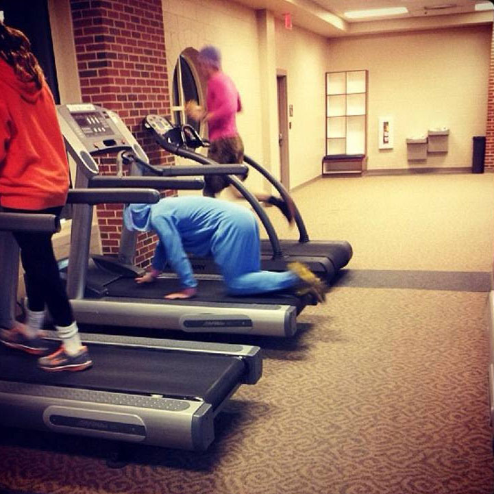 Treadmill accidents are more common in a gym than you would expect. Two things may be happening in this picture. The first option is that the person was using the machine at a very fast speed and fell. Another reason behind their position is that the treadmill is at a normal speed, but they have become too tired to stand properly. Whatever the case, you must remember not to sit or bend on a treadmill. The belt will continue to move, and you may get hurt due to it. This is why always turn off the machine if you’re tired.