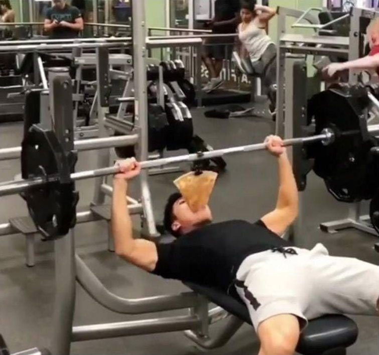Some individuals prefer to consume a protein bar prior to commencing their exercise regimen. Nevertheless, it is uncommon to witness someone eating while working out. It appears that this individual believes that consuming a pizza while using a workout machine will cancel out all the calories. He might even be using the slice as a form of motivation to increase the weight he is lifting. Regardless of the scenario, it is undoubtedly intriguing to observe someone working out with pizza in hand at the gym. What’s intriguing is that eating while lifting weights can be hazardous. This person may have experienced nausea immediately after completing the workout session.