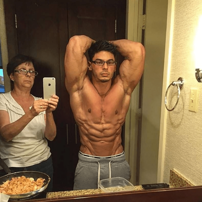 While most individuals opt to take a solo mirror selfie in the bathroom for a good picture, this individual’s approach differs as he seeks his mother’s help for the shot. The rationale behind his choice is his focus on flexing his muscles, leaving his hands occupied. However, he overlooks instructing his mother to stay out of the frame. Adding to the confusion is the coexistence of food items and a storage container on the table, blurring the distinction between a kitchen and a bathroom setting.