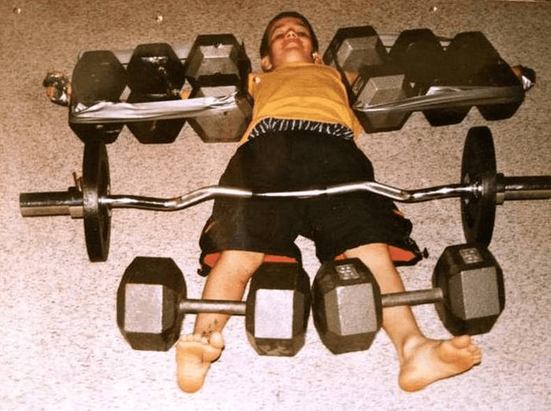 It is difficult to figure out what this kid is trying to do in this picture. He is not old enough to lift most of these weights without an adult’s supervision. The child may have been trying to create a creative photo for his social media pages. He is thin enough for his feet and hands to stay in the spaces beneath the bars without getting hurt. Someone may have challenged the kid to do this and to take a picture as proof. His parents may also have punished him this way and made him lie in one place.