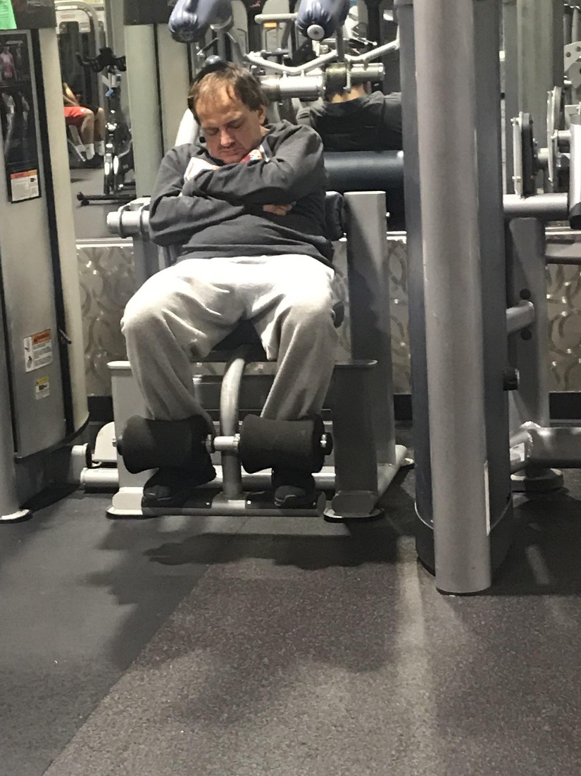Not all individuals who frequent the gym do so voluntarily. Certain individuals may feel compelled to go to the gym as a result of familial expectations or other factors. The idea of waking up early to exercise for weight loss may not be appealing to everyone. The individual depicted in the photograph appears to fit into this category. He might have been coerced into going to the gym, leading him to take a nap there. Alternatively, he could have chosen to go on his own accord but grew tired during his workout. This behavior may have upset others who were waiting to use the equipment.