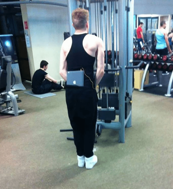 This individual appears to be a fan of iPods, but these gadgets are difficult to obtain nowadays. As a result, they seem to be using an iPad to listen to music while at the gym. However, there are several disadvantages to using a tablet in this setting. The tablet’s size makes it challenging to move between various gym equipment, prompting the person to tuck the iPad into their workout pants. Nevertheless, this setup seems peculiar as the device restricts their movements and could potentially get damaged during other exercises or while sitting down.