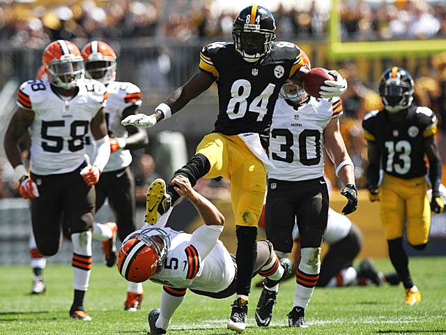 Sep 7, 2014; Pittsburgh, PA, USA; Pittsburgh Steelers wide receiver Antonio Brown (84) runs over Cleveland Browns punter Spencer Lanning (5) during the first half at Heinz Field. Brown was flagged on the play. Mandatory Credit: Jason Bridge-USA TODAY Sports
